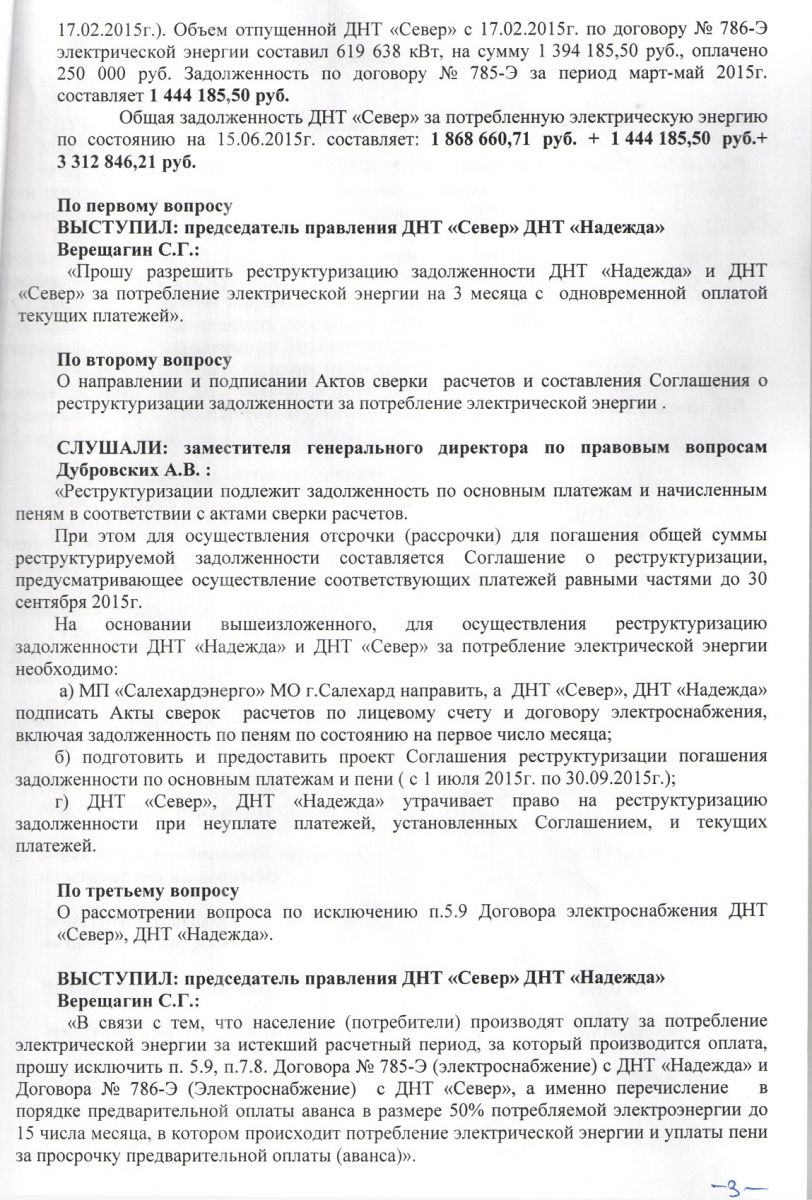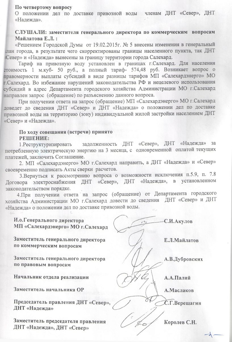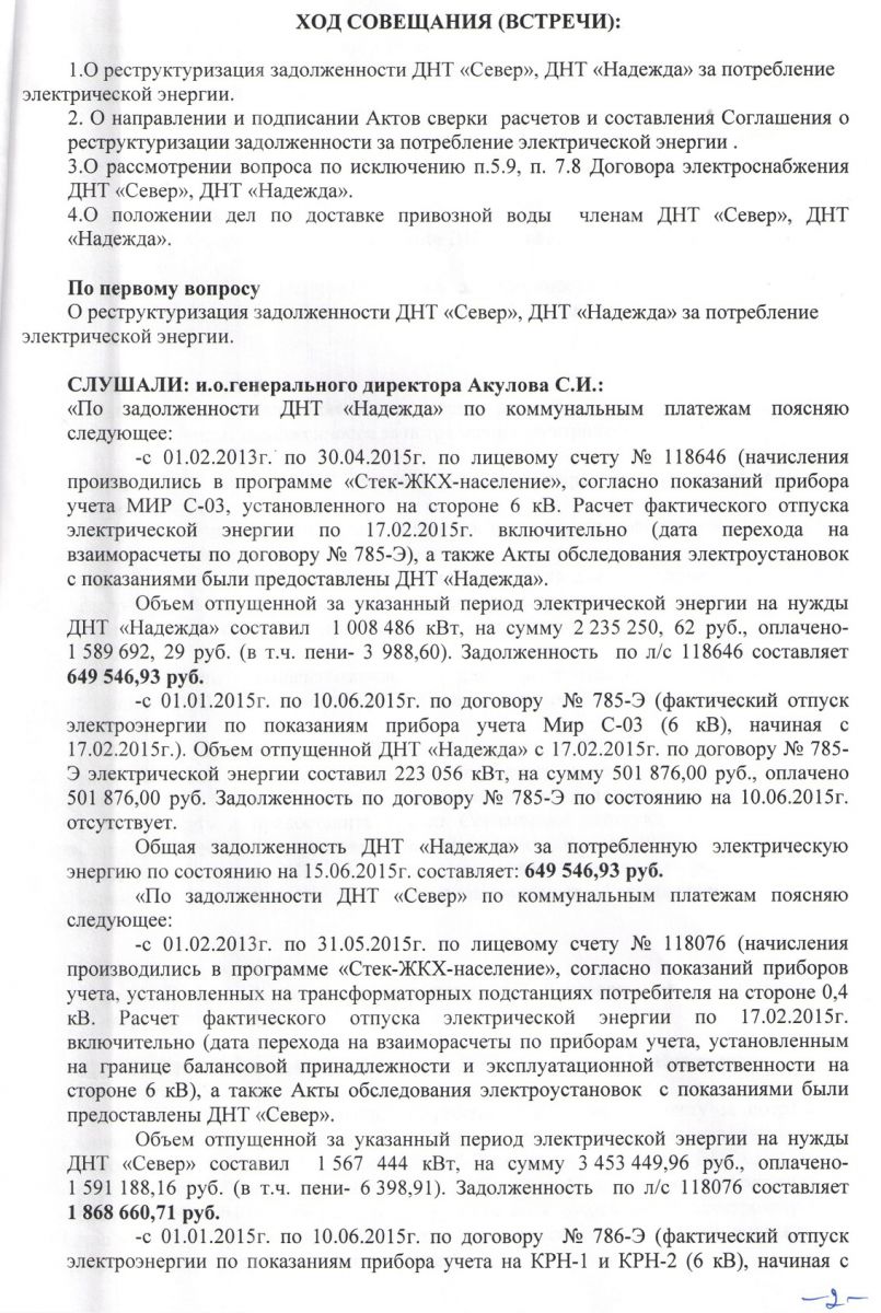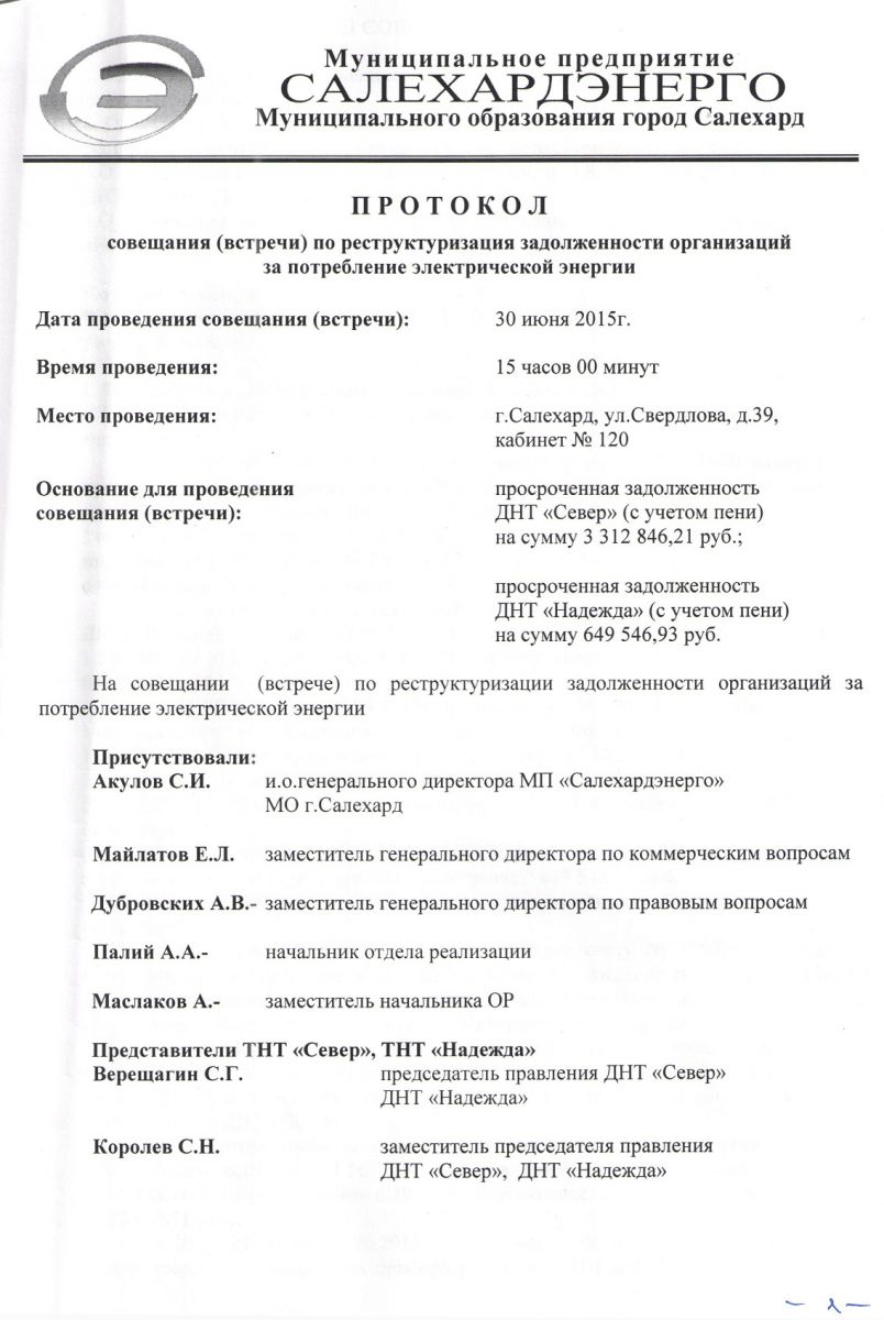 | Протокол совещания (встречи) по реструктуризации задолженности организаций за потребление электрической энергии от 30.06.2015г.